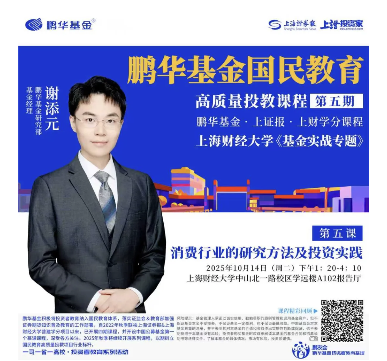 2025年9月9日,上海证券报携手鹏华基金,以上海财经大学为支点重磅打造的高质量国民教育课程标杆项目——高质量国民教育投教第五期课程《基金实战专题》正式开课。主办方特邀鹏华基金8位顶尖基本面投资专家担任主讲老师,聚焦“创新科技、创新消费、创新国粹”主题,覆盖科技、消费、医药、半导体、化工、AI等多个关乎国家产业发展命脉的赛道,贴合全球产业趋势与中国经济转型方向。